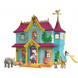 Contenido: Figuras: 1 mujer, 1 niño, 1 niña; Animales: 1 elefante pequeño, 1 jirafa pequeña, 1 mapache, 1 mapache pequeño, 1 cachorro de guepardo, 1 mono con pañal, 1 búho, 2 suricatas, 1 tejón, 1 camaleón, 1 pato, 1 cacatúa; Accesorios: 1 casita, 1 escalera, 1 árbol en maceta, 1 plataforma giratoria para jugar, 1 hamaca para bebés, 1 columpio, 1 baúl con manta, 3 cuencos de fruta y verdura, 1 mesa, 1 banco, 1 silla, 1 mecedora, 1 cesta de mimbre, 1 servicio de café, 3 botellas de bebida con soporte