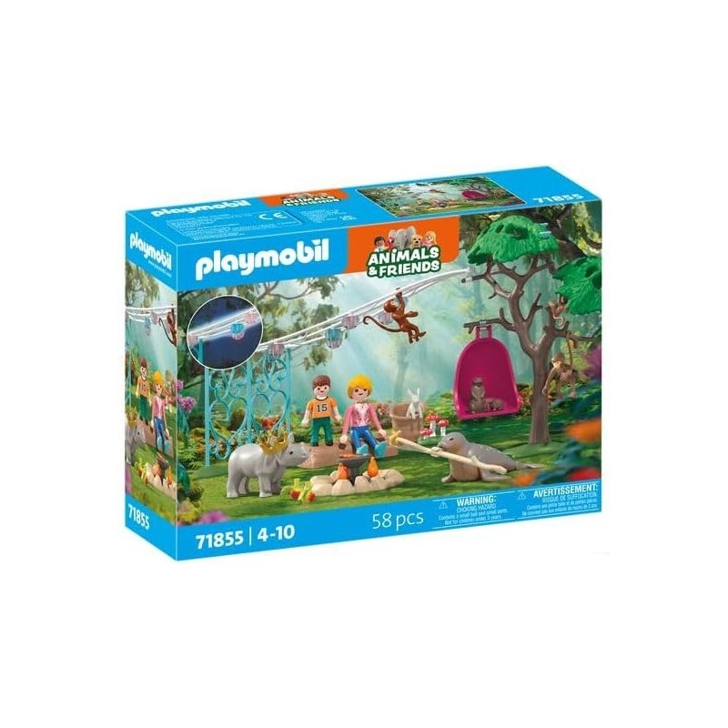 ¡Es la hora de la fiesta en el bosque PLAYMOBIL! Todos se reúnen bajo la guirnalda que brilla en la oscuridad para celebrarlo con música, juegos y deliciosas golosinas. La silla colgante giratoria es el lugar favorito tanto de los animales como de los invitados e invitadas, mientras que un plátano se puede asar en la hoguera. Con una corona de cumpleaños para compartir y acogedores asientos alrededor del fuego, cada detalle añade diversión a la fiesta. Este alegre producto PLAYMOBIL incluye adorables animales, accesorios y todo lo necesario para vivir imaginativas aventuras de cumpleaños que brillan, ¡de día o de noche!