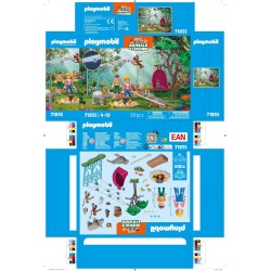 Contenido: Figuras: 1 mujer, 1 niño; Animales: 1 foca, 1 conejo, 1rinoceronte pequeño, 1 castor, 1 cría de nutria, 2 monos, 1 mono pequeño, 4 pájaros; Accesorios: 1 árbol con placa base y silla colgante, 1 placa base con elemento de valla, 1 guirnalda con farolillos, 1 placa base con setas, 1 hoguera con cuenco de barbacoa y fruta, 1 rama, 1 tronco de árbol tumbado, 1 saco de yute, 1 corona de cumpleaños
