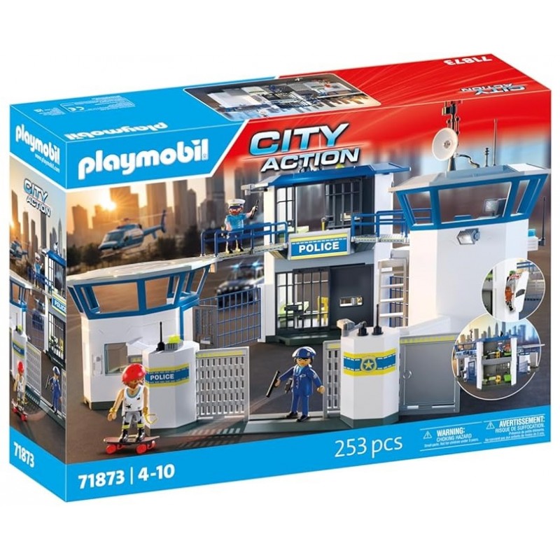 Contenido: Figuras: 1 policía, 1 mujer policía, 1 delincuente; Accesorios: 1 cuartel de policía, 1 escritorio con PC y sistema telefónico, 1 armario para armas, 2 retretes con lavabo, 1 bandeja de asiento, 1 escritorio, 2 sillas, 2 sillas de madera, 2 pares de esposas, 2 porras, 2 pistolas rápidas, 2 boinas, 4 pistolas, 2 cepillos de dientes, 2 tubos para cepillos de dientes, 2 tazas, 2 cucharas, 2 platos, 1 escáner de huellas dactilares, 2 folios de huellas dactilares, 1 busto, 1 uniforme de presidiario, 1 flash, 1 ordenador portátil, 1 dictáfono, 1 reloj de pulsera, 1 collar, 1 caja, 2 tarjetas, 1 monopatín, 1 radio, 4 candados, 1 casco de patinador, 1 gorra de policía, 1 gorra