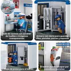 ¡Cuidado con los delincuentes! Los agentes están preparados con escáneres de huellas dactilares, un armario de armas con cerradura e incluso uniformes de presidiario para vestir a los sospechosos. Atrapa a los delincuentes que escapan por las brechas ocultas en las paredes y emprende una persecución desde el helipuerto. Con un gánster en monopatín, una bulliciosa sala de control y montones de accesorios, los detectives en ciernes podrán sumergirse en un sinfín de historias de lucha contra el crimen. ¡Este producto PLAYMOBIL lleno de acción promete diversión trepidante y giros ingeniosos en cada misión!