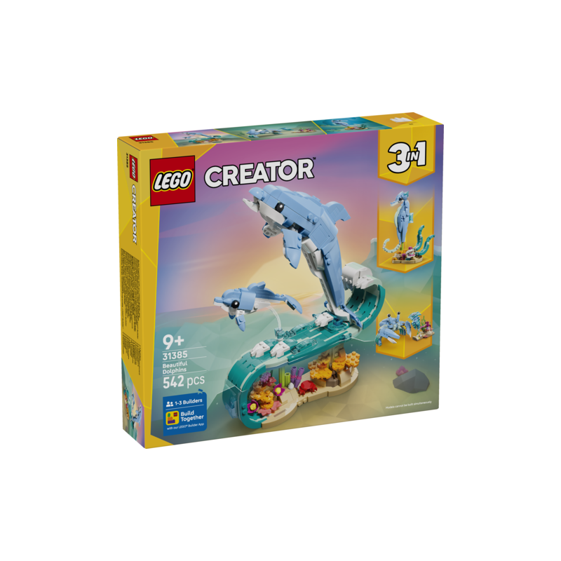 El set de construcción LEGO® Creator “3 en 1” Animales Marinos: Hermosos Delfines (31385) invita a los peques a partir de 9 años a interpretar divertidas historias. Este juego para niñas y niños les permite construir 3 figuras de animales marinos diferentes con los mismos ladrillos. Pueden construir un dinámico modelo formado por un delfín adulto y su cría, con partes articuladas, saltando en la cresta de una ola sobre corales. Esto podrán convertirlo después en un caballito de mar articulado sobre un vistoso soporte con algas y una almeja articulada, o en un cangrejo junto a plantas marinas y una medusa. Al acabar de jugar, cada modelo se puede exponer en una estantería o un escritorio. Este set LEGO Creator “3 en 1” estimulará la imaginación de los más jóvenes y es una fantástica idea de regalo para pequeños amantes de los animales marinos. Además, la app LEGO Builder les permite construir con confianza. Los modelos no se pueden construir simultáneamente. El set contiene 542 piezas.