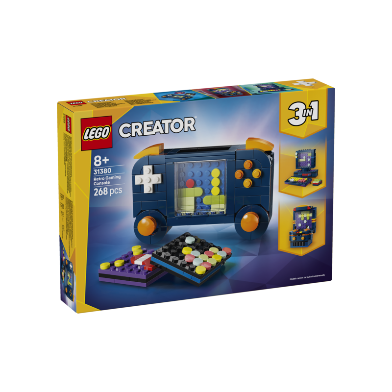 A los peques y los gamers a partir de 8 años les encantará construir el set LEGO® Creator “3 en 1” Consola de Videojuegos Retro (31380), exponerlo y jugar con él. Este detallado y divertido objeto de decoración para el cuarto de juegos se puede construir de 3 formas distintas con los mismos ladrillos. Los niños y las niñas pueden construir una consola de videojuegos portátil de juguete con 2 mandos móviles y 2 botones móviles, así como 3 cartuchos de juego para insertarlos en ella. Esto podránconvertirlo después en un miniordenador de escritorio con teclado y monitor, disco para colocar dentro y ratón, o transformarlo en una máquina recreativa. Este set LEGO Creator “3 en 1” estimulará la imaginación de los peques y es un fantástico regalo para adultos nostálgicos. Además, la app LEGO Builder reserva a los niños una sencilla e intuitiva aventura de construcción con sus instrucciones 3D y herramientas. Los modelos no se pueden construir simultáneamente. El set contiene 268 piezas.