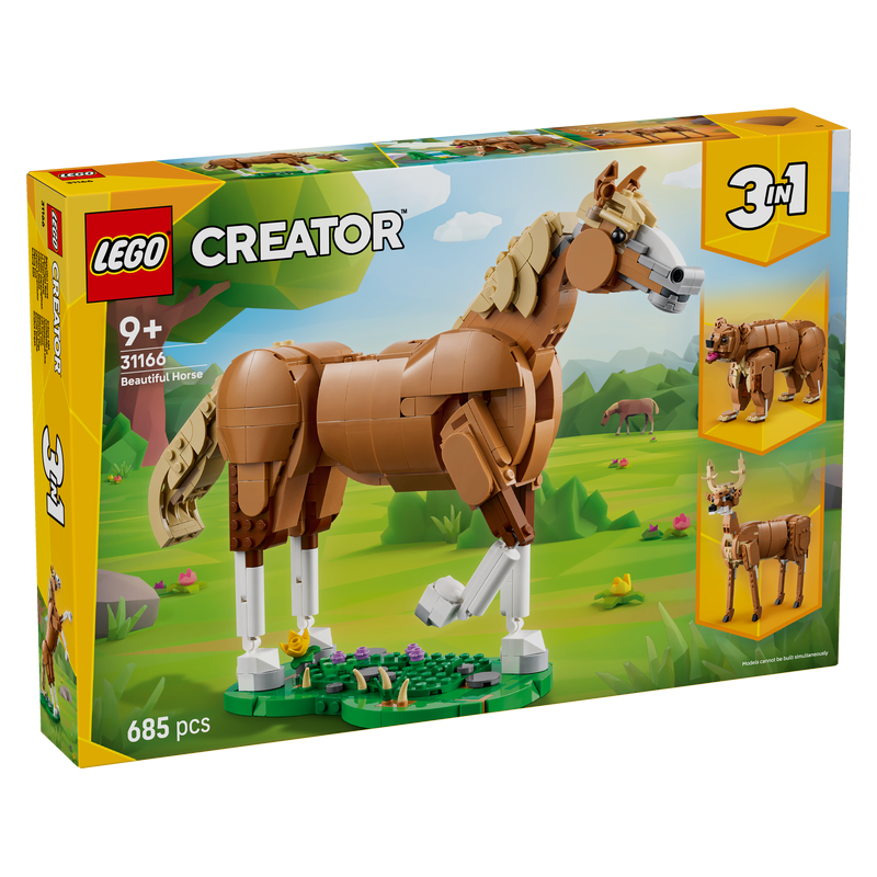 Los niños y las niñas a partir de 9 años disfrutarán de divertidas historias llenas de amor por los animales con el set de construcción Caballo Noble (31166). El caballo de juguete articulado mueve la cabeza, el cuello, la grupa, los tobillos, la cola y una de las rodillas, y viene con una base con efecto de hierba donde los peques podrán exponerlo en 3 posturas: apoyado sobre 3 o 4 patas, o erguido sobre las 2 traseras.