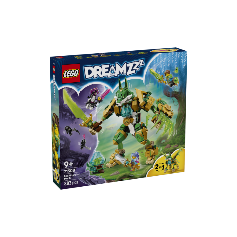 Desata la imaginación de tu peque con el set LEGO® DREAMZzz™ Meca Guardián Zorro (71508), un meca de juguete de fantasía para niños y niñas a partir de 9 años que ofrece 2 opciones de construcción. Los jóvenes soñadores se lo pasarán genial construyendo un zorro como un poderoso Meca Guerrero Zorro, erguido sobre 2 patas y armado con espada y escudo, o como un majestuoso Guardián Zorro de 4 patas provisto de alas. Las minifiguras de Mateo, Izzie y el Emperador Pesadilla inspirarán imaginativas historias, y cada una cuenta con una espada personalizada en un color a juego con su personaje. Además, los niños se divertirán descubriendo 2 figuras de Grimspawns, una figura de Z-Blob y un huevo de diamante del que nace una Criatura del Tesoro verde. Un épico regalo de cumpleaños, este juguete incluye instrucciones de construcción con historia que ayudan a los soñadores a sumergirse en la acción. También están disponibles en versión digital en la app LEGO Builder. El set contiene 883 piezas.
