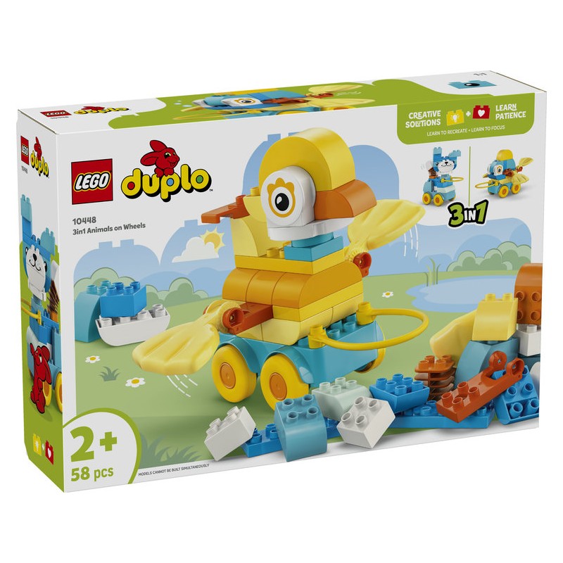 ¡Potencia la creatividad de tu bebé con el juguete de aprendizaje Animales sobre Ruedas 3en1 (10448)! Los pequeños amantes de los animales encontrarán infinitas formas de disfrutar del juego imaginativo mientras construyen el pato, el pez o el perro de juguete, ¡o crean otros animales! Los niños y las niñas en edad preescolar con pasión por los vehículos LEGO® DUPLO® construyen sus figuras en una base y se lo pasan genial empujándolas para verlas rodar o tirando de ellas por el asa.