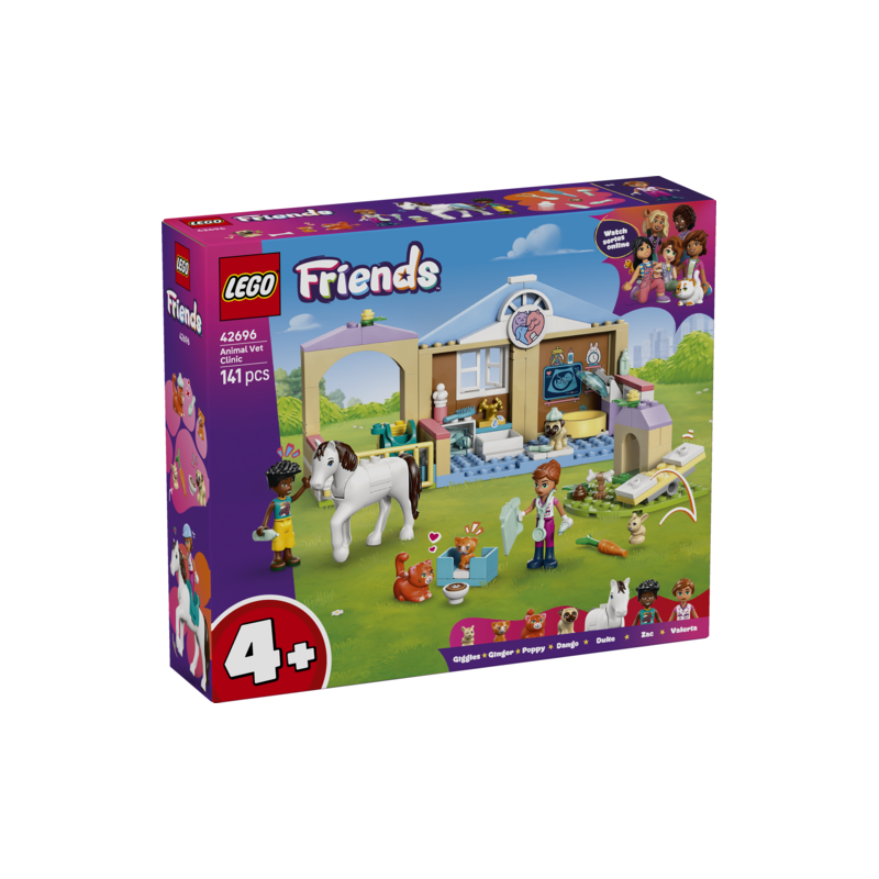 Anima a tu peque a construir sus propias historias con el juego LEGO® Friends Clínica Veterinaria de Animales (42696) para niñas y niños a partir de 4 años. El detallado set le ofrece todo lo que necesita para jugar a interpretar roles y cuidar deanimales. Hay un establo, una sala de exploración, camas, comida, equipo veterinario, un parque de juegos para mascotas y más. El set incluye minipersonajes de Zac y Valeria, además de figuras de un caballo, un perro, un conejito y 2 gatos. Trae tambié n una jeringa, un termómetro y una tablilla con sujetapapeles y bolígrafo que estimularán el juego imaginativo. Para el caballo, hay una montura, heno, un cepillo, una zanahoria, agua, popó de caballo y un casco de jinete. Este set es un divertidoregalo para preescolares. Los sets LEGO 4+ para el desarrollo cuentan con grandes piezas que ayudan a los niños a dar los primeros pasos, y la app LEGO Builder será su guía en una divertida experiencia de construcción. El set contiene 141 piezas.