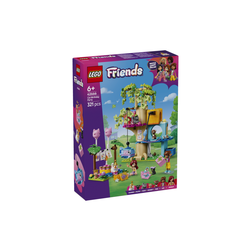 El set sitúa la escena en la fiesta de cumpleaños de Churro. Han venido 4 amigos felinos de Churro, y también los personajes de LEGO Friends Leo y Paisley. Explora los divertidos detalles, como los regalos, las banderolas y los globos con forma de gato. A los peques les encantará enseñarles la casa del árbol a las mascotas, donde hay una piñata con forma de pez, un juguete para gatos, hierba gatera, una fuente de agua y un arenero. Después, los gatos se sentarán en la mesa giratoria para comer tarta.