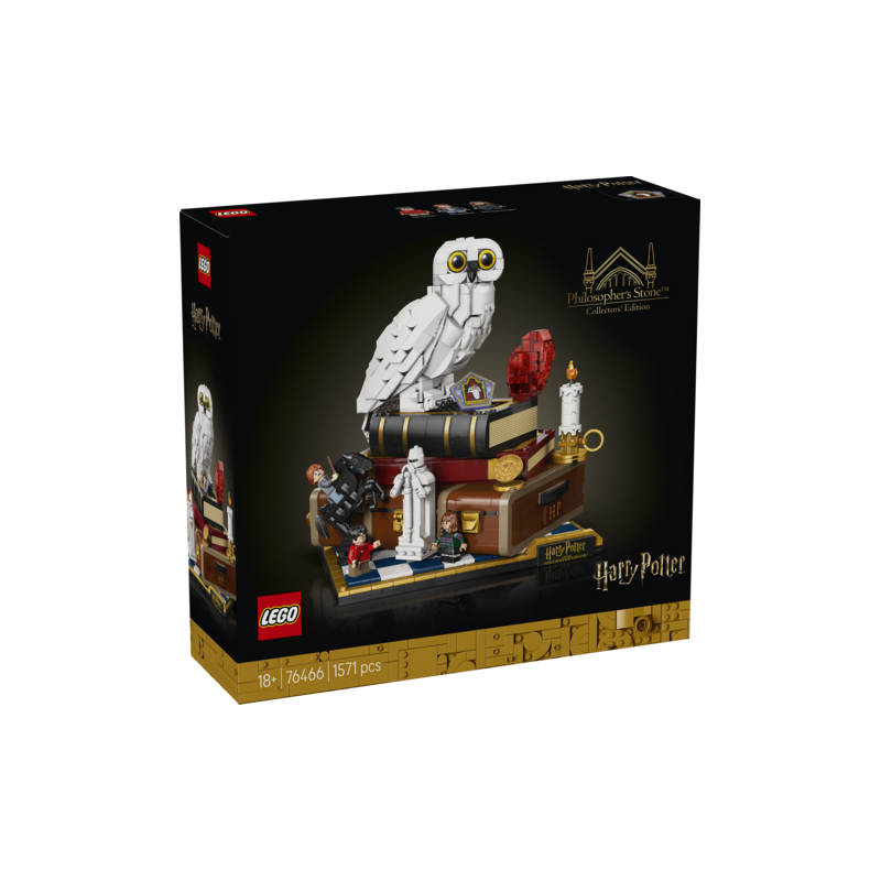 Construye un nostálgico homenaje a Harry Potter y la piedra filosofal™ en su 25º aniversario con el set LEGO® Harry Potter™ Piedra Filosofal: Edición para Coleccionistas (76466). Este creativo regalo para fans adultos de Harry Potter incluye divertidas funciones, personajes y objetos, así como versiones a microescala de escenas clásicas que despertarán mágicos recuerdos. Crea la primera figura LEGO de Hedwig™ con las alas cerradas y exponla junto a la Piedra Filosofal sobre el baúl de Harry Potter. Agrega 3 minifiguras LEGO Harry Potter (Harry Potter, Hermione Granger™ y Ron Weasley™), además de elementos como un cromo de la rana de chocolate y un tablero de ajedrez mágico. Usa las 3 ruedas para girar la cabeza de Hedwig, mover la reinaen el tablero y volar un lado del baúl para descubrir la escena del ataque del trol de montaña. Las demás escenas representan el Expreso de Hogwarts™ y las 5 pruebas que debe superar Harry para llegar a la Piedra Filosofal. El set contiene 1571 piezas.