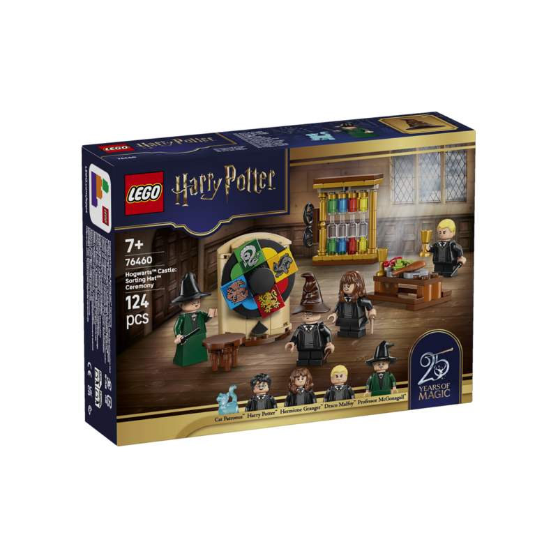 Revive la ceremonia del Sombrero Seleccionador en el Castillo de Hogwarts™ que aparece en Harry Potter y la piedra filosofal™ con este set de construcción LEGO® Harry Potter™ (76460). El divertido juguete, inspirado en Harry Potter e ideal como regalo para niños, niñas y fans a partir de 7 años, cuenta con 4 minifiguras LEGO Harry Potter: la Profesora McGonagall™, Harry Potter, Hermione Granger™ y Draco Malfoy™. Coloca el Sombrero Seleccionador en la cabeza de cada alumno y gira la “ruleta de selección” para descubrir a qué casa de Hogwarts pertenecerá. Una mesa de comedor y un marcador de puntos de las casas amplían las posibilidades de juego. Este kit de aventuras rinde homenaje al primer set LEGO Harry Potter (4701), lanzado en 2001, e incluye uno de los Patronus coleccionables que integran la edición conmemorativa del 25.º aniversario: el Patronus™ gato de la Profesora McGonagall. Este set cabe dentro del Castillo de Hogwarts: Gran Comedor (76435). Contiene 124 piezas.