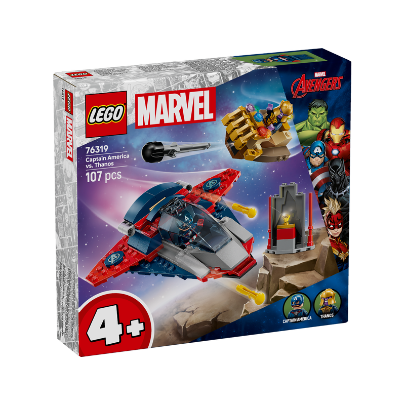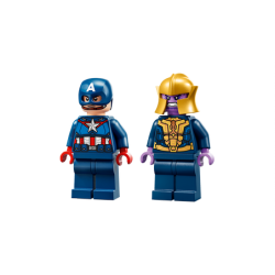 El juguete incluye 2 minifiguras: Thanos, en una nave espacial con la forma de su Guantelete del Infinito que cuenta con “dedos” móviles y un lanzamisiles, y el Capitán América, en un Quinjet superaerodinámico con 2 cañones, cabina abatible y compartimento oculto para su escudo. También hay un modelo independiente con una piedra cósmica para jugar a imaginar qué sucede cuando el Capitán América trata de impedir que Thanos robe la valiosa gema. La caja contiene bolsas de ladrillos (con un gran ladrillo para principiantes en cada una) y un colorido folleto de instrucciones.