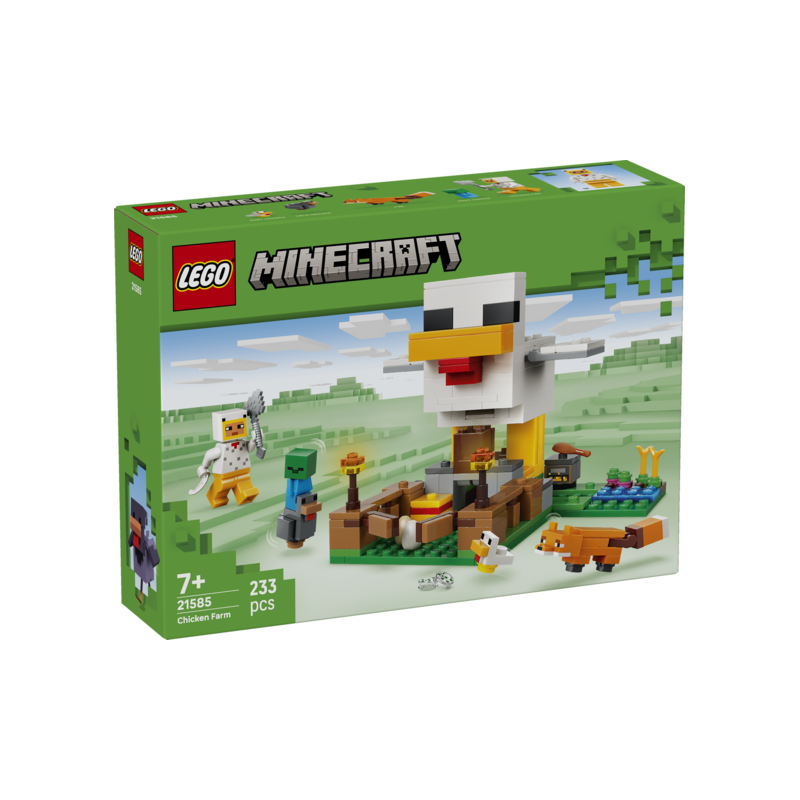 Cría gallinas y cultiva productos con el juguete LEGO® Minecraft® La Granja de Gallinas (21585) para niñas y niños a partir de 7 años. Este set de construcción desafía a los jugadores a cuidar de una gallina fría y una gallina bebé con una minifigura del Fan del Pollo mientras se enfrentan a un zorro (a quien le gusta comer gallina fría) y un zombi bebé (a quien le gusta hacer de jinete a lomos de las gallinas). El gallinero de juguete tiene forma de gallina con alas móviles y un corral delante con una puerta que se abre. La gallina gigante pone huevos y también vierte semillas por la boca en un contenedor que se inclina cuando las gallinas necesitan comida. Incluye divertidos accesorios: antorchas, heno, un ahumador, 2 huevos, 2 montones de semillas, un muslo de pollo, una pluma y un hacha. Esta fantástica idea de regalo para jugadores de Minecraft, constructores LEGO y fans de los sets de decoración inspirados en videojuegos viene con la app LEGO Builder. El set contiene 233 piezas.