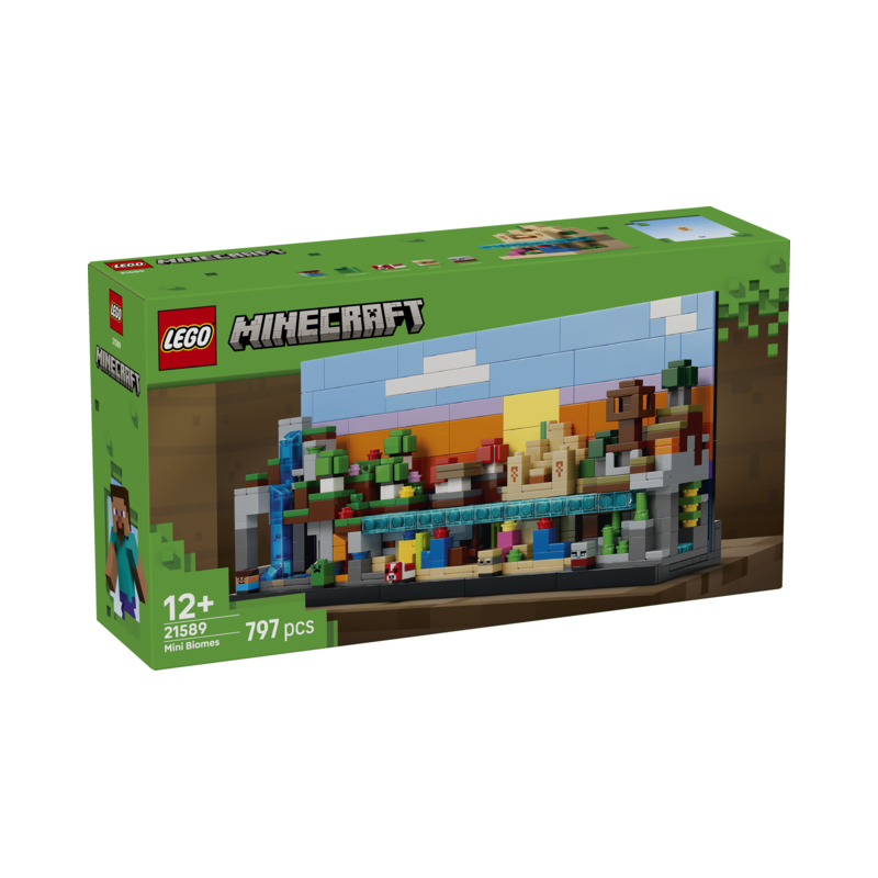 Rinde homenaje a Minecraft® de una forma decorativa con el set de construcción LEGO® Minecraft Minibiomas (21589) para niños y niñas a partir de 12 años. Los jugadores de Minecraft podrán mostrarles a todos su pasión por el juego creando 5 biomas con 5 microfiguras: Steve, un Creeper™, una Champiñaca, un Pusilánime y un Saqueador. El set LEGO Minecraft cuenta con 5 biomas desmontables: Montaña (con cueva de espeleotema, geoda de amatista y cascada), Bosque Floral (con cueva, lava y oro), Campos de Champiñones (con arrecife de coral, naufragio, 2 champiñones rojos enormes y champiñón marrón), Desierto (con templo, arrecife de coral, océano, cactus y cofre de tesoros) y Sabana (con puesto de Saqueadores, cueva frondosa, árboles de acacia, calabaza, lava y playa). Incluye también un fondo reversible (día/noche). Este set es un regalo ideal para jugadores de Minecraft y fans de LEGO. Además, con la app LEGO Builder, los peques podrán construir con confianza. Contiene 797 piezas.