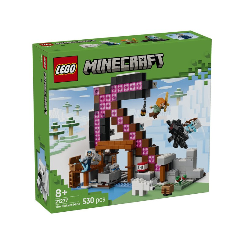 El set incluye 3 minifiguras: la popular Alex, un minero y un jinete arácnido err ante. También hay una figura de un oso polar bebé en la superficie de la mina. Los niños extraen mineral Minecraft de la mina, lo cargan en la vagoneta y lo transportan por la vía para guardarlo en un cofre. La vagoneta se puede llenar con dinamita y lanzar contra la pared rocosa, abriéndose paso hacia el otro lado de una explosión. Cuando las aventuras mineras del día llegan a su fin, el pico de juguete LEGO Minecraft se convierte en un impactante objeto decorativo. Contiene 530 piezas.