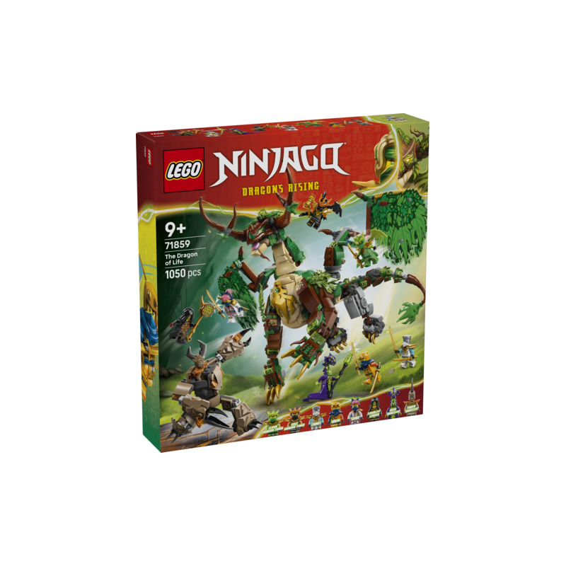 A los niños y las niñas a partir de 9 años les encantará construir el juguete ninja LEGO® NINJAGO® Dragón de la Vida (71859) y luego recrear escenas de la temporada 4 de NINJAGO: El renacer de los dragones. Este dragón tiene alas desplegables, posee mandíbula, cabeza, cuello, piernas, tobillos, garras y cola articulados, y cuenta con montura para una minifigura. El juego incluye un modelo complementario con un árbol y una planta que gira y oculta una espada dorada, además de un minimodelo de un meca articulado con cabina para una minifigura. Hay 8 minifiguras: los ninja Zane, Sora y Arin, Lloyd Forma Dragón y Cole Forma Dragón, y el trío de villanos formado por el Monstruo Ácido, el Monstruo de Tierra y el líder lealista. Los sets LEGO NINJAGO transportan a los fans de los ninja a un mundo de fantasía para jugar e imaginar con sus héroes. Cada juego se puede construir usando la app LEGO Builder, que ofrece instrucciones digitales interactivas y mucho más. El set contiene 1050 piezas.