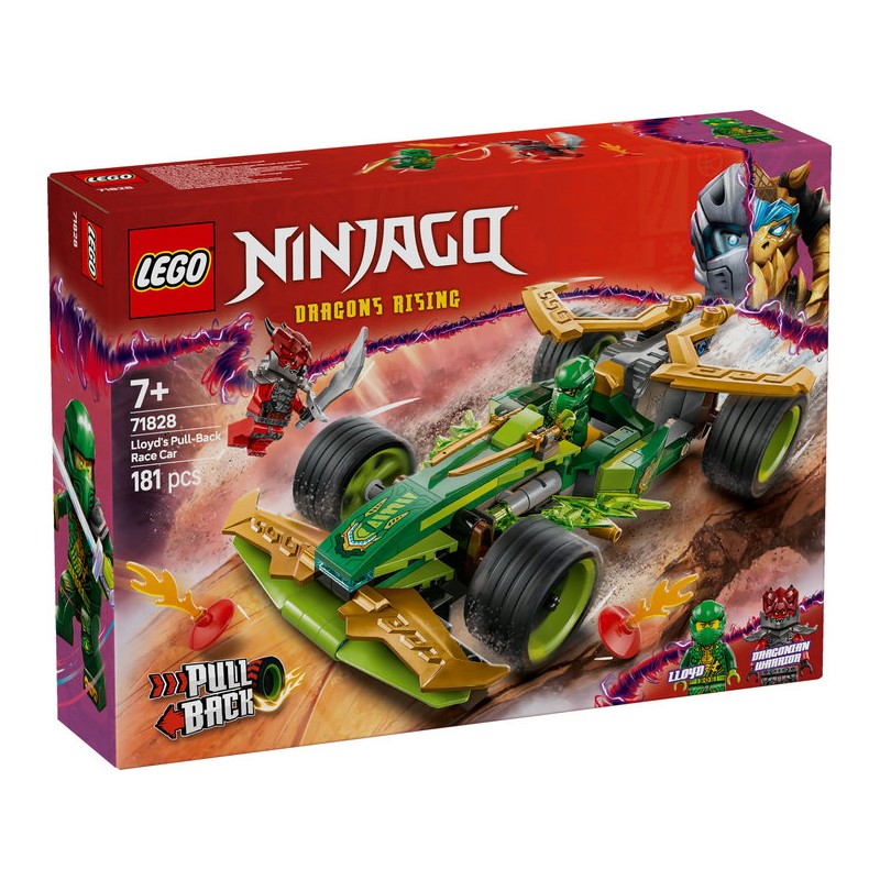 ¡Sorprende a tu joven ninja con el primer coche de carreras de carga manual NINJAGO®! Los niños y las niñas a partir de 7 años podrán recrear la trepidante acción de la temporada 3 de la serie para televisión NINJAGO: El renacer de los dragones con el Coche de Carreras con Motor de Carga Manual de Lloyd (71828). Este aerodinámico vehículo de 4 ruedas cuenta con espacio en el habitáculo para una minifigura y está decorado con Espadas del Rayo verdes. Tira de él hacia atrás, suéltalo, ¡y míralo avanzar a gran velocidad!