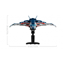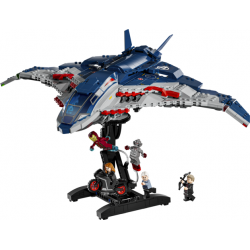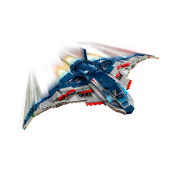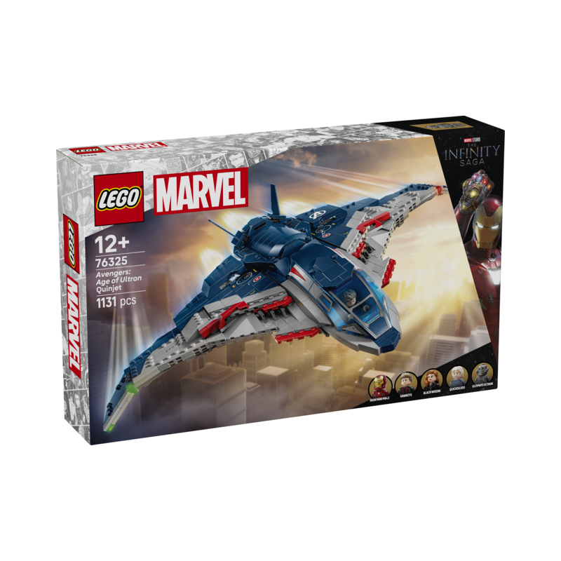 La maqueta construible del Quinjet viene con 5 minifiguras: Viuda Negra (con su moto), Iron Man, Quicksilver, Ultrón Supremo y Ojo de Halcón (con su arco y flecha). Las minifiguras pueden colocarse en diferentes lugares de la nave. El Quinjet está equipado con cabina abatible, 2 cañones frontales que disparan y espacio para guardar las armas de Viuda Negra y el arco de Ojo de Halcón. La compuerta posterior se abre para cargar la moto o sacarla. El soporte incluido, desmontable y giratorio, permite contemplar la emblemática aeronave desde todos los ángulos. Para construir este set de 1131 piezas cuentas con la ayuda de la app LEGO Builder.