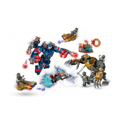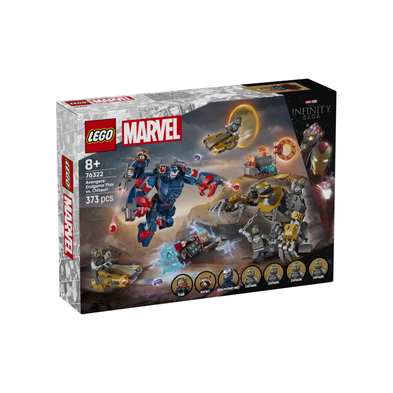 Basado en una inolvidable escena de batalla de Marvel Vengadores, este set construible incluye 2 grandes figuras LEGO: la armadura Iron Patriot, con 4 cañones que disparan, y un temible gorila Chitauri. Ambas poseen uniones articuladas para aportar dinamismo al juego. Hay 7 minifiguras: Iron Patriot MK2; Rocket, con un gran cañón; Thor, con el Destructor de Tormentas; y 4 Chitauri, 2 de ellos con cañones dorados. El set cuenta también con 2 aeromotos y un pequeño entorno para Thor donde se puede guardar la munición. Amplía la experiencia de juego conectándolo al set Batalla final de Vengadores: Endgame (76323). Contiene 373 piezas.